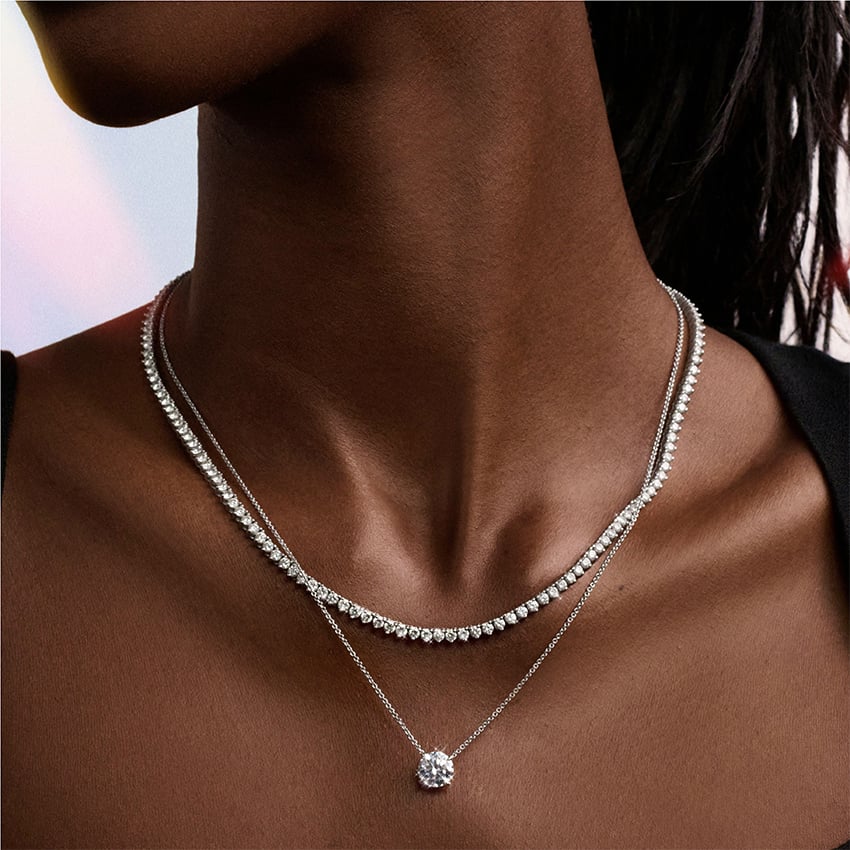 Timeless and resplendent, this show-stopping tennis necklace features dazzling round diamonds that produce an aura of shimmering, eye-catching light.