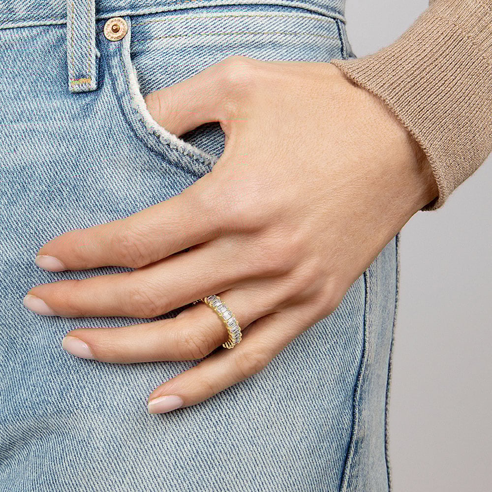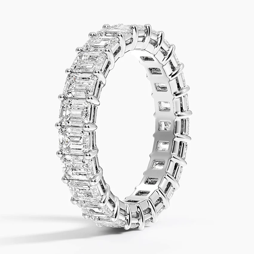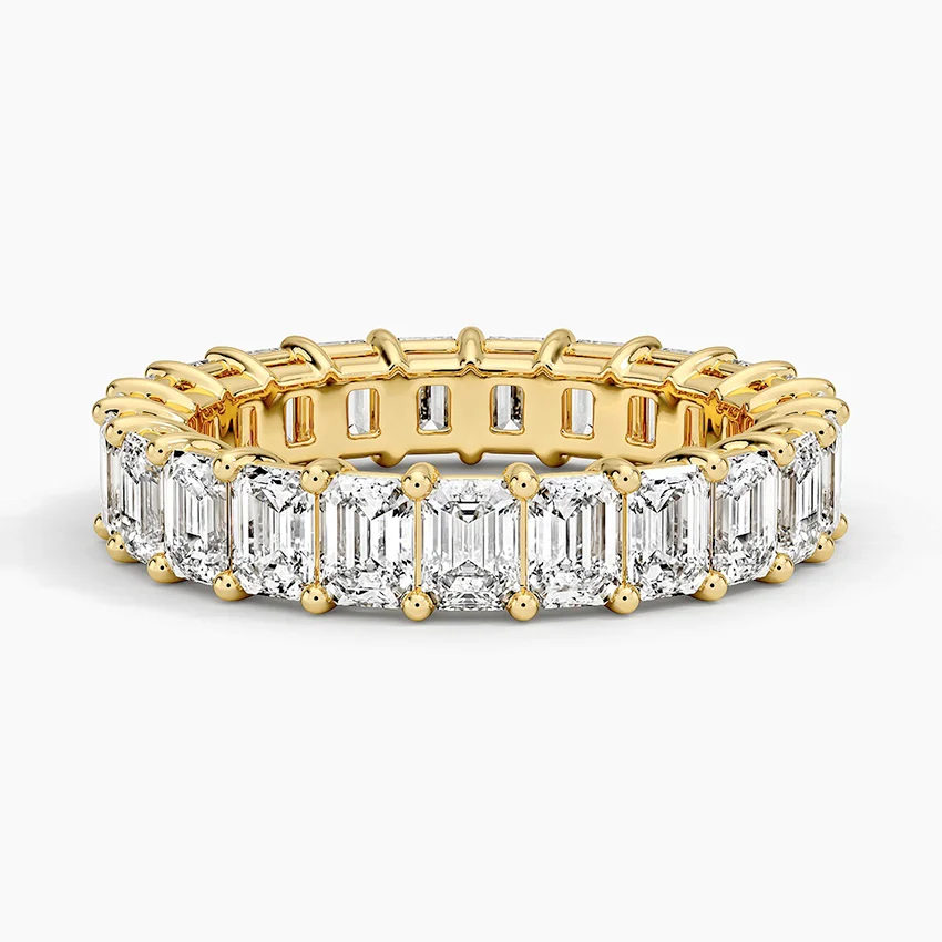 This dazzling ring features prong-set emerald cut lab grown diamonds that encircle the finger for a timeless, eye-catching look.